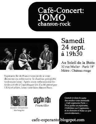 A l'occasion de la Journée Européenne des Langues, Esperanto Ile-de-France vous invite à venir découvrir - ou redécouvrir - le chanteur polyglotte toulousain Jomo. Après avoir enthousiasmé les foules cet été à Copenhague (où il a été primé par UEA) et à Kiev, jOmO vient faire danser Paris.